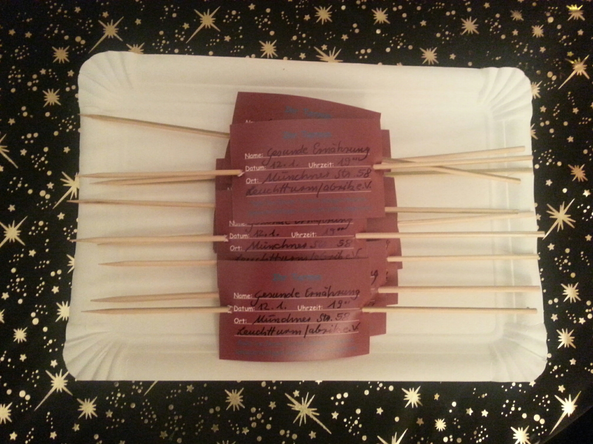 Das sind nicht etwa Schaschlik-Spieße und auch keine Haarspangen, sondern Einladungskarten für die gestrige Veranstaltung “Ich passe in kein Korsett – warum maßgeschneiderte Ernährung am besten passt.“